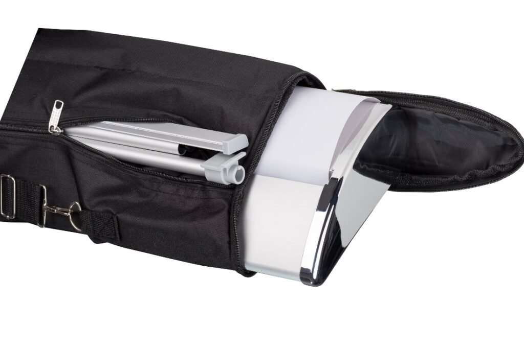 - Мобільність і зручність. Легкий корпус, компактна сумка для транспортування — стенд можна взяти з собою на будь-який захід